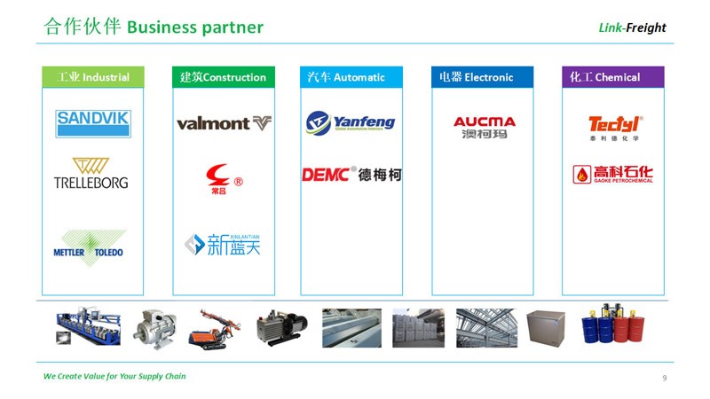 公司的主要客户遍及食品、工业、建筑、汽车、电器和化工领域,通过与这些国际跨国公司的合作,让公司在合作中学习和成长,并逐渐积累了这些主要行业的物流操作经验,尤其包括食品、大件运输与化工品这类需要特殊作业,对安全有较高要求的物流操作。公司在如何满足客户要求,如何提高终端客户满意度,如和确保供应链安全方面积累了丰富的经验。