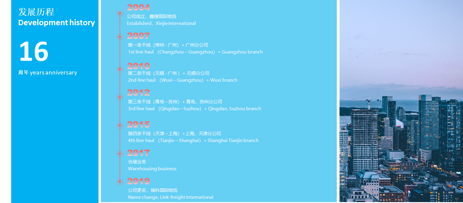 2004年成立瑞科国际物流,至今已16年的历史,原公司名字为鑫捷国际物流,主营国内合同物流业务。