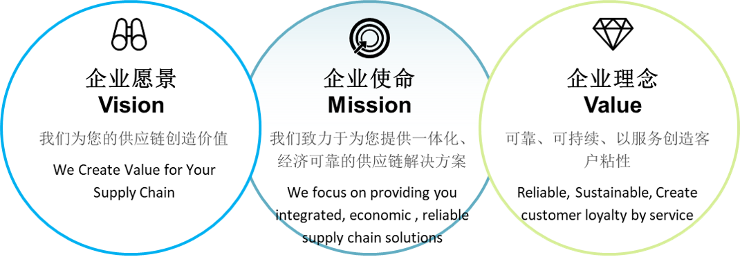 企业愿景:我们为您的供应链创造价值。 企业使命:我们致力于为您提供一体化、经济可靠的供应链解决方案。 企业理念:可靠、可持续、以服务创造客户粘性。